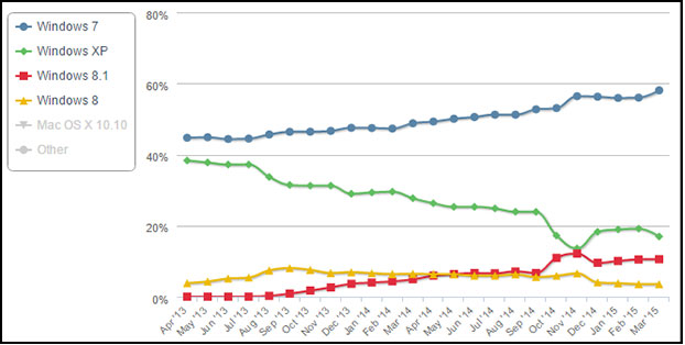 Չնայած, որ Windows XP օպերացիոն համակարգը թողարկվել է 14 տարի առաջ և մեկ տարի առաջ դադարեցվել է դրա տեխնիկական աջակցությունը, այնուամենայնիվ այս օպերացիոն համակարգից օգտվում են Windows-ի օգտատերերի 20%-ը: Անցած տարվա նոյեմբերին Windows 8 և 8.1 համակարգերգի օգտատերերի քանակը 18.6% էր, իսկ Windows XP-ինը՝ 13.5%: Սակայն հաջորդ ամսում XP-ի օգտատերերի թիվը շատացավ 4.6%-ով, իսկ 8.x-ի օգտատերերի քանակը նվազեց համարյա նույնքանով: